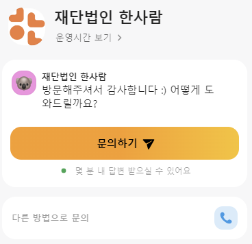 유선상 연결이 어려우신 경우, 한사람재단 홈페이지 내의 채널톡으로 후원자님의 연락처를 남겨주시면 곧 전화드리겠습니다.너그러운 이해를 부탁드립니다.